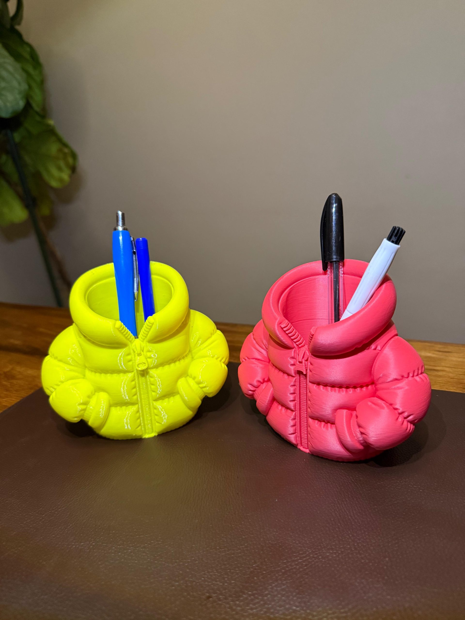 Level up your desk setup with the ultimate accessory. This 3D printed pen holder features a stylish, quilted puffer jacket design that stands out.